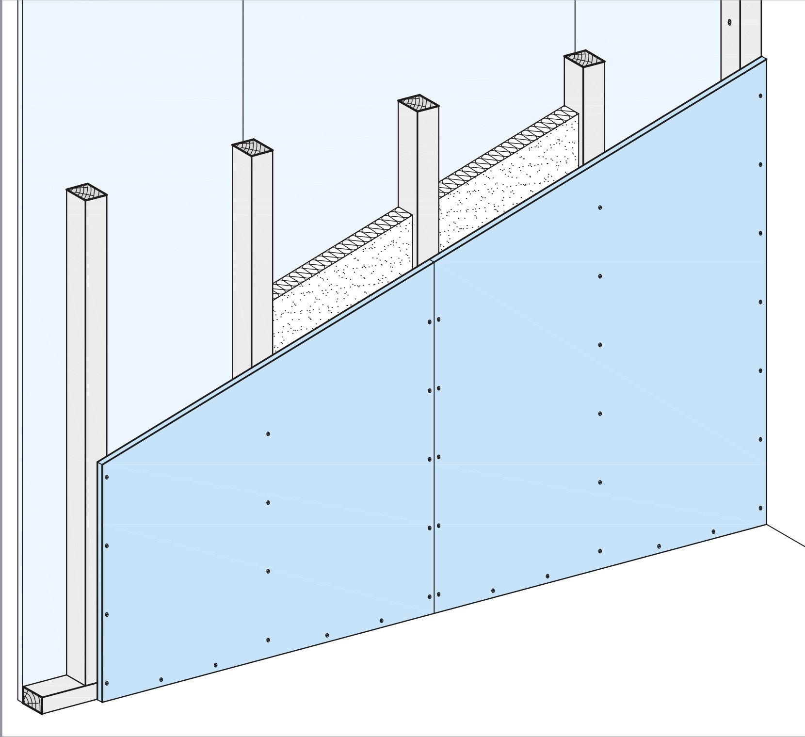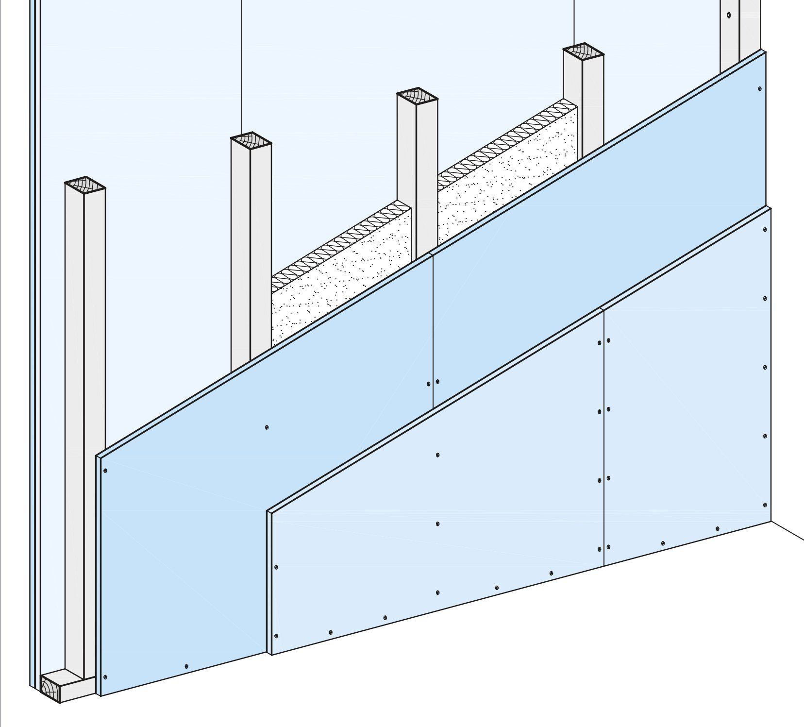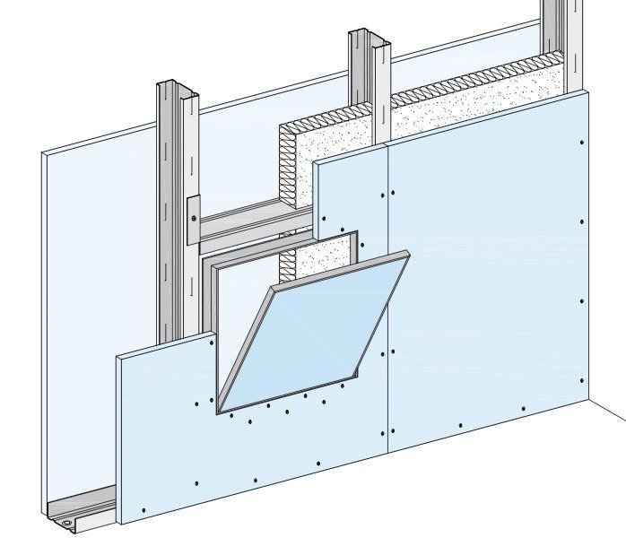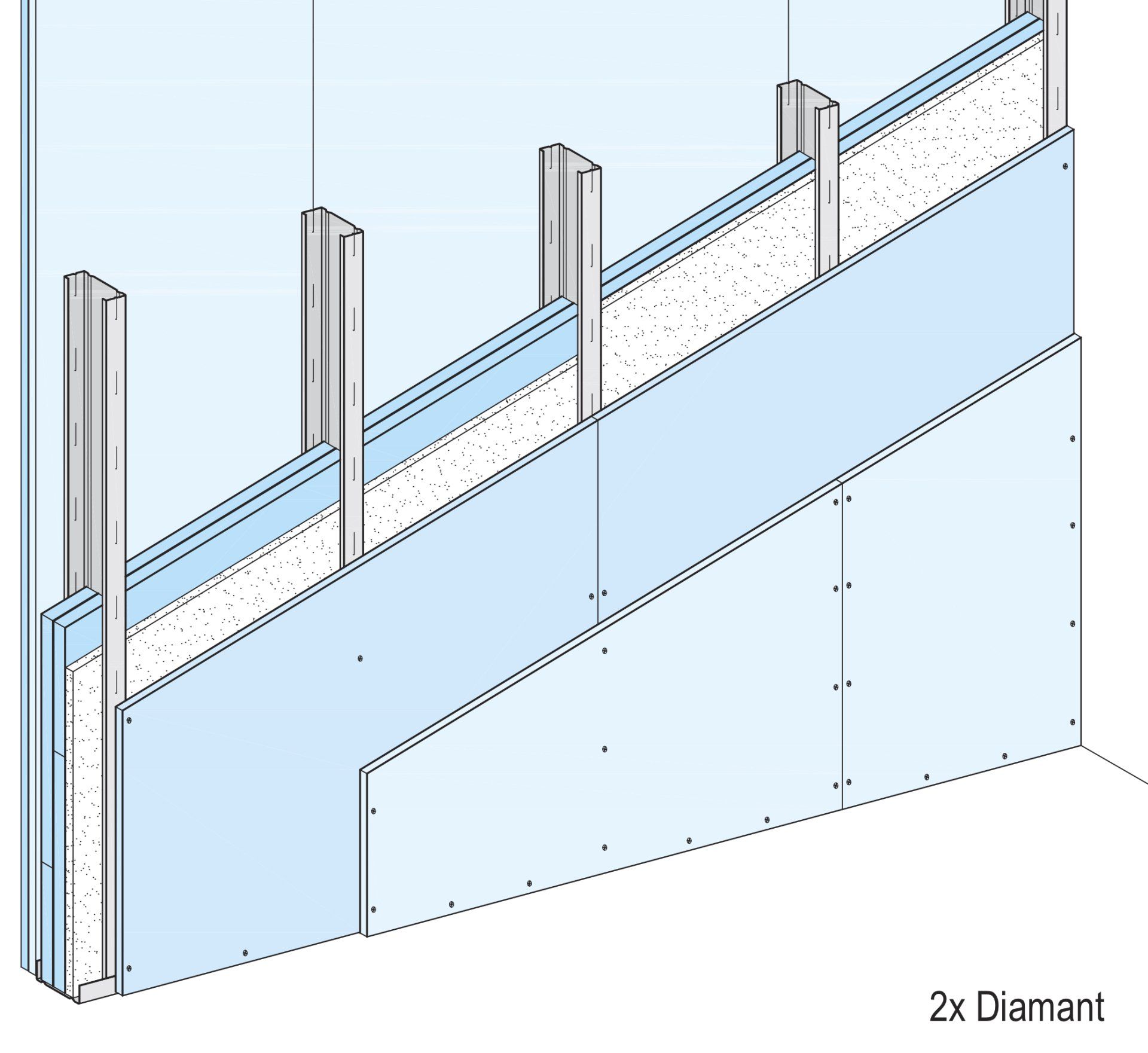 Knauf Sicherheitswände bestehen aus einem Einfachständerwerk und beidseitiger zweilagi- ger Beplankung aus Knauf Diamant Platten mit horizontal verlegten Stahlblecheinlagen zwi- schen den Beplankungslagen. Das Ständerwerk wird umlaufend mit den angrenzenden Bauteilen verbunden. Im Wandhohlraum können Dämm- stoffe bei Schall- und Wärmeschutz-Anforderun- gen eingebaut werden.