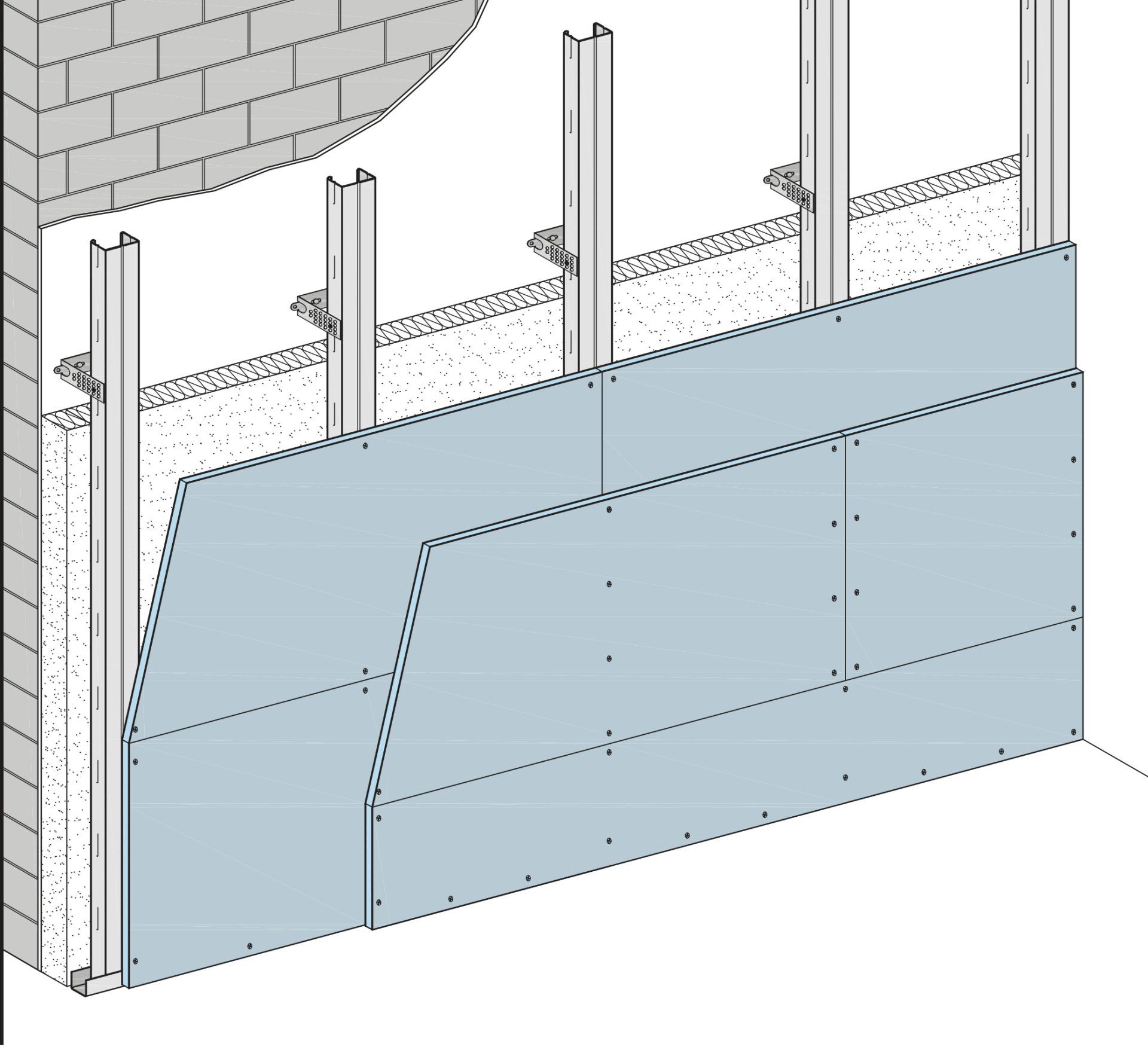 Das Vorsatzschalensystem W625 ist ein freistehendes System, mit einer Unterkonstruktion aus CW 75 oder CW100. Die Beplankung mit Gipsplatten wird einlagig ausgeführt.