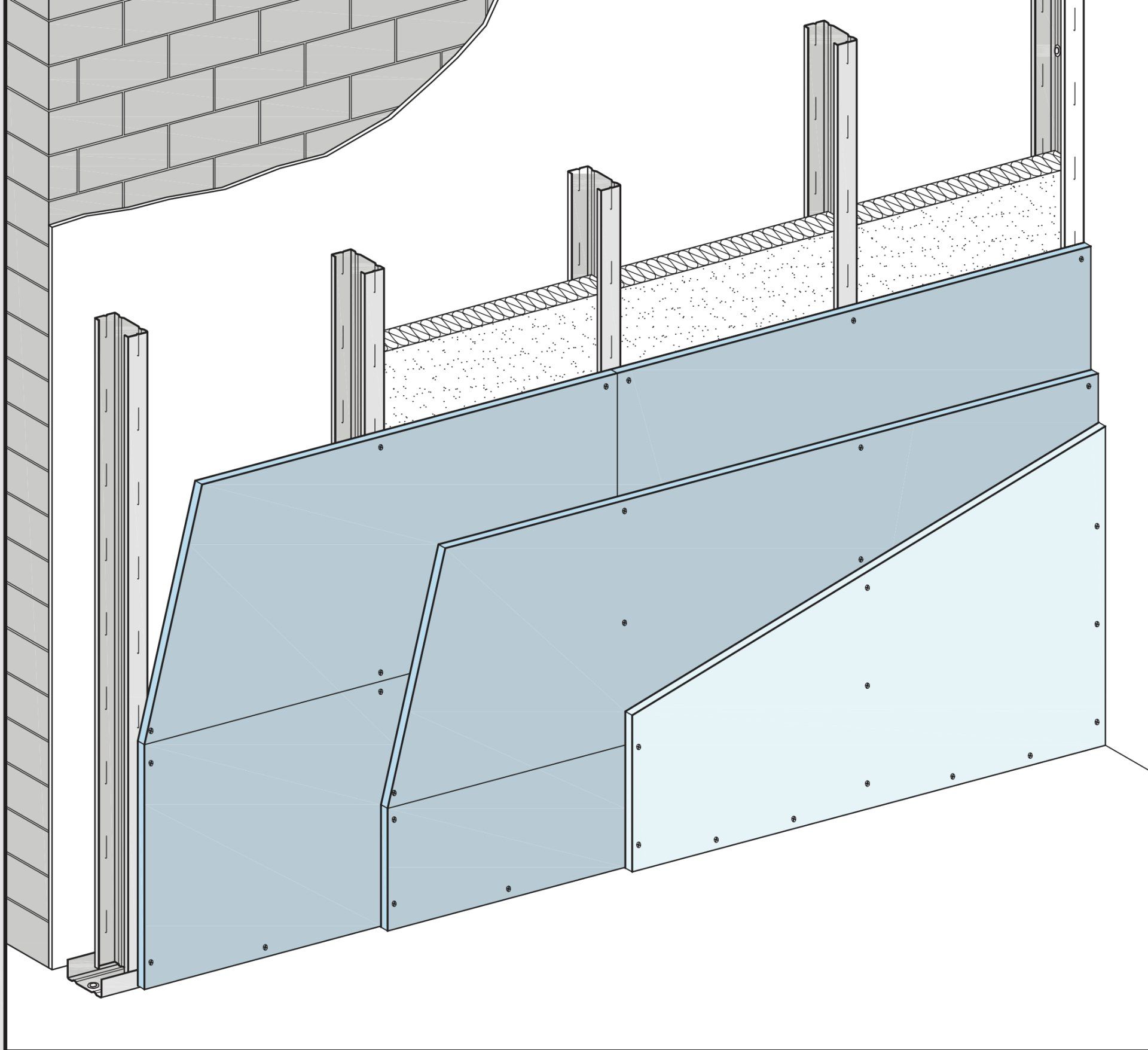 Knauf Sicherheitswände bestehen aus einem Einfachständerwerk und beidseitiger zweilagi- ger Beplankung aus Knauf Diamant Platten mit horizontal verlegten Stahlblecheinlagen zwi- schen den Beplankungslagen. Das Ständerwerk wird umlaufend mit den angrenzenden Bauteilen verbunden. Im Wandhohlraum können Dämm- stoffe bei Schall- und Wärmeschutz-Anforderun- gen eingebaut werden.